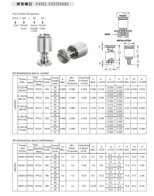 蘇州易扣公司可生產(chǎn)的彈簧螺釘分兩種材質(zhì),碳鋼的表示為PFS2,不銹鋼的表示為PFC2。
