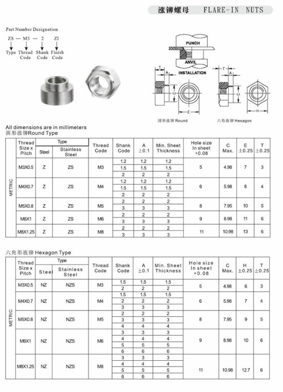 Z型漲鉚螺母主要分為圓頭漲鉚螺母、六角漲鉚螺母、K型漲鉚螺母,漲鉚螺母也是用于鈑金連接,它的使用方法有別于壓鉚螺母類,壓鉚類的螺母是用壓接的方式安裝,而漲鉚螺母安裝時利用漲鉚螺母本身的膨脹而將鋼板牢牢鉚住,這樣的鉚接方式的好處是鉚接鋼板不會變形。這種漲鉚螺母安裝方便,牢固、美觀,被廣泛用于鈑金、電腦、機(jī)箱機(jī)柜、電子通訊行業(yè)。碳鋼漲鉚螺母和不銹鋼材質(zhì)漲鉚螺母蘇州易扣公司都可以生產(chǎn),交貨及時,保證質(zhì)量。 蘇州易扣生產(chǎn)的漲鉚螺母符合歐盟環(huán)保要求,可以提供SGS報告。